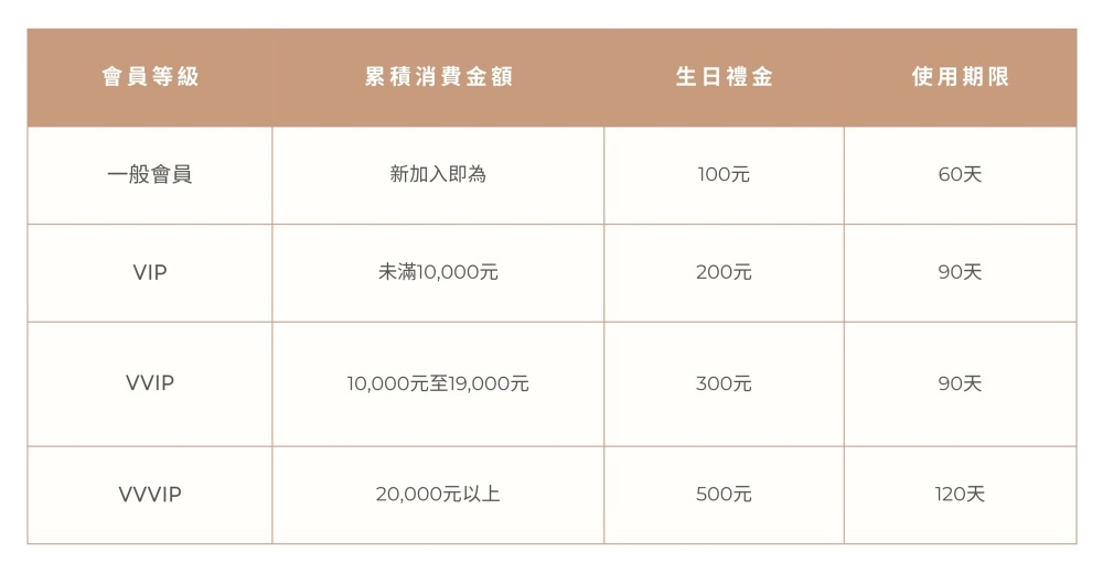 每年生日當月發送對應等級生日禮金,限時使用,逾期失效,不得展延。