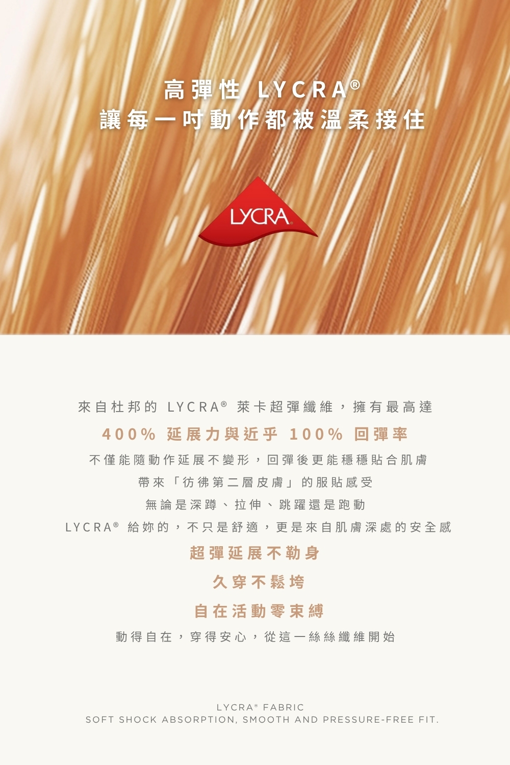 採用高密度LYCRA®萊卡超彈纖維,實現5倍延展、99%回彈的穩定包覆力,