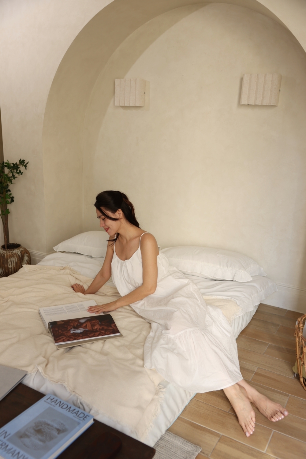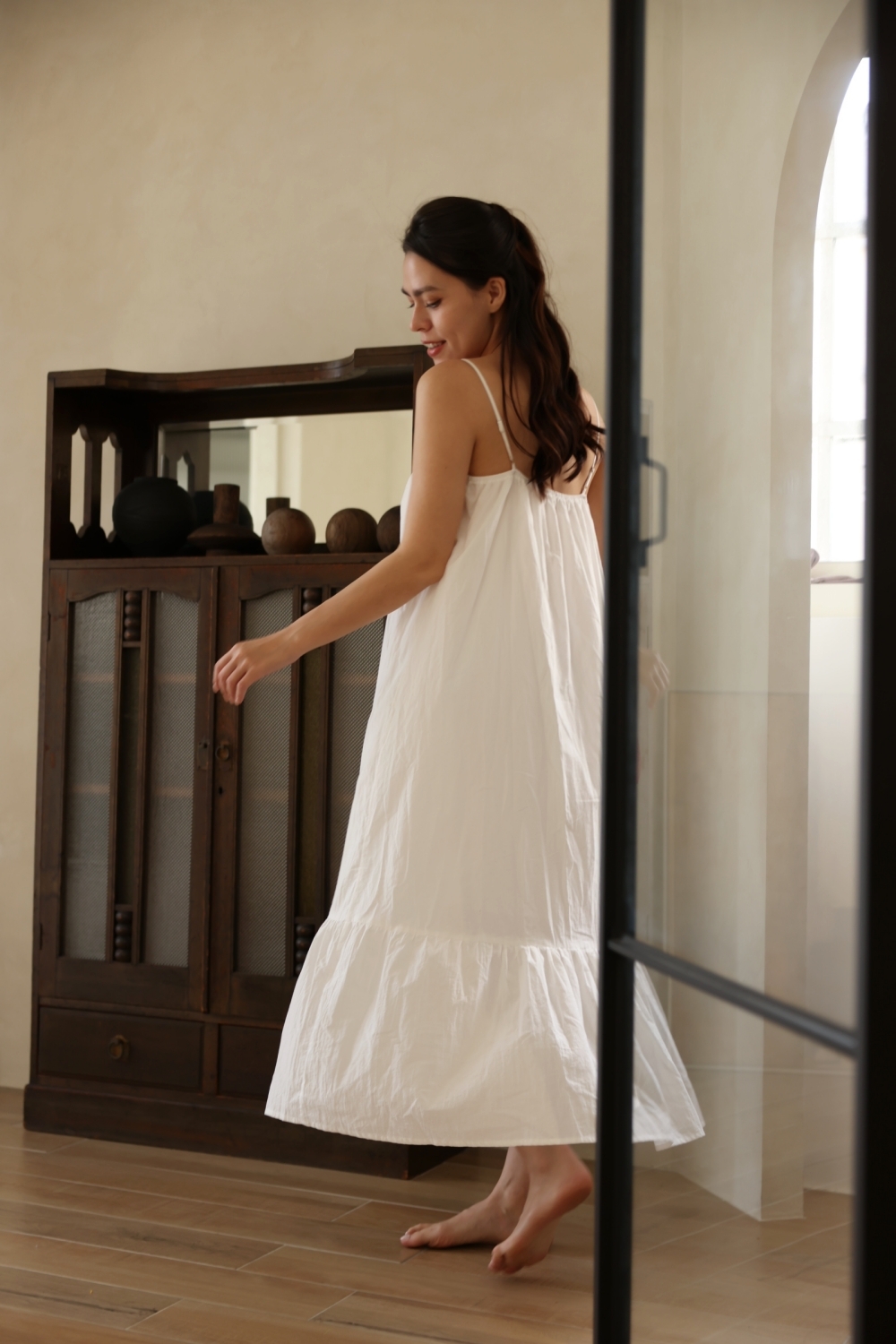 這件洋裝以柔軟輕棉製成,輕盈如浪、隨性如風,