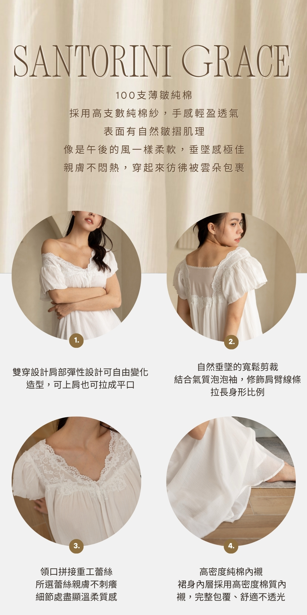 1. 高支數100支薄皺純棉紗,手感輕盈透氣,表面有自然皺摺肌理,像是午後的風一樣柔軟,垂墜感極佳、親膚不悶熱,穿起來彷彿被雲朵包裹。