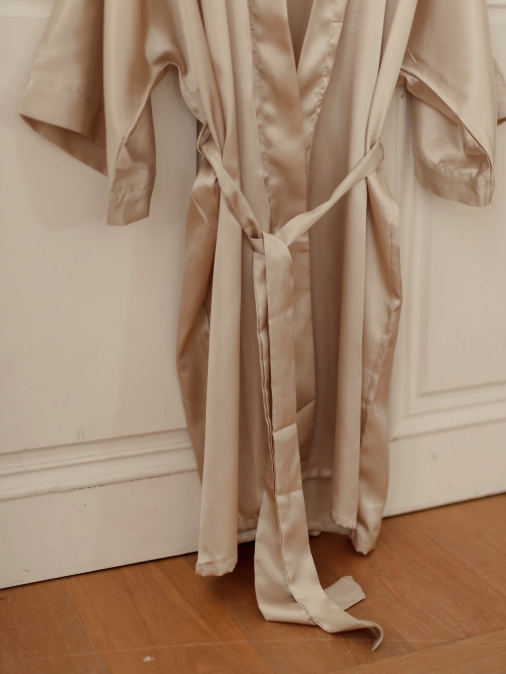 奢光緞面新娘睡袍,以絲緞光澤映襯肌膚,勾勒出低調奢華的氛圍。