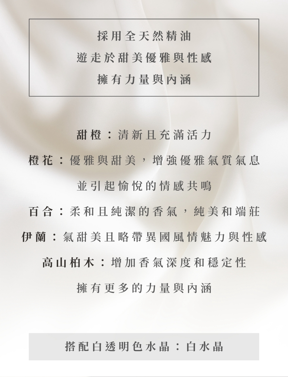 採用全天然精油,融合大自然清新與自由奔放的木質花香調氣息: