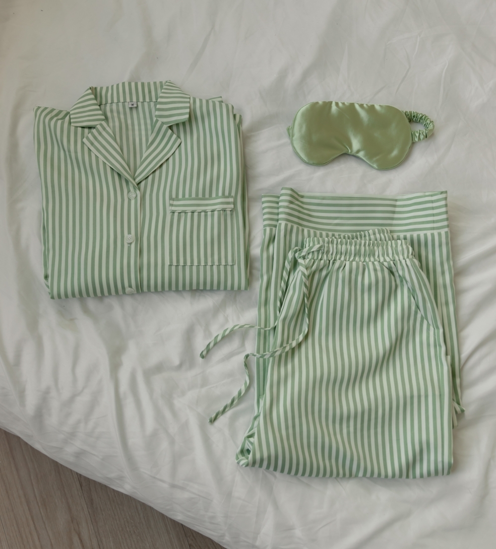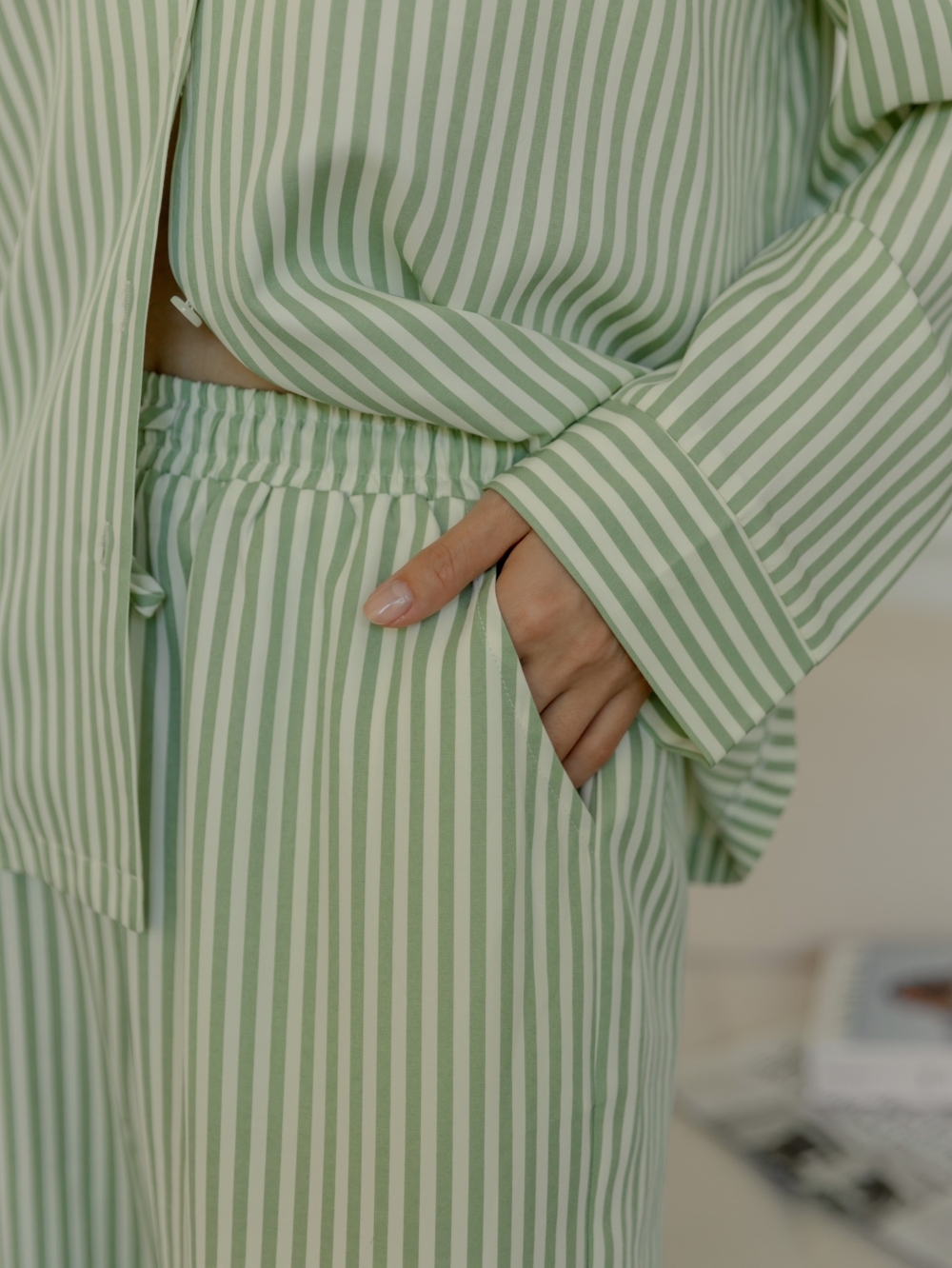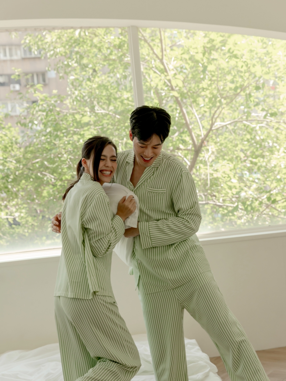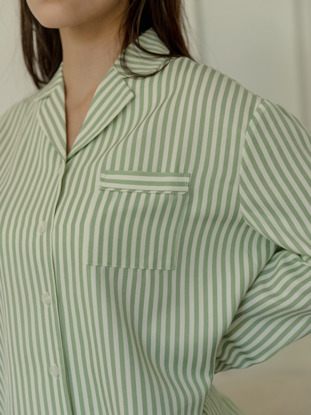 若葉綠條紋布料成分稍有不同, 75% 聚酯纖維 25% 嫘縈,體驗超柔軟舒適兼具墜性感。