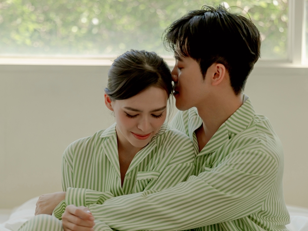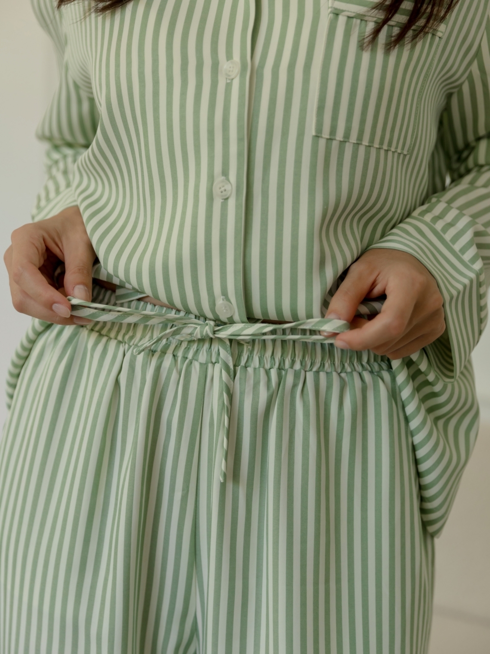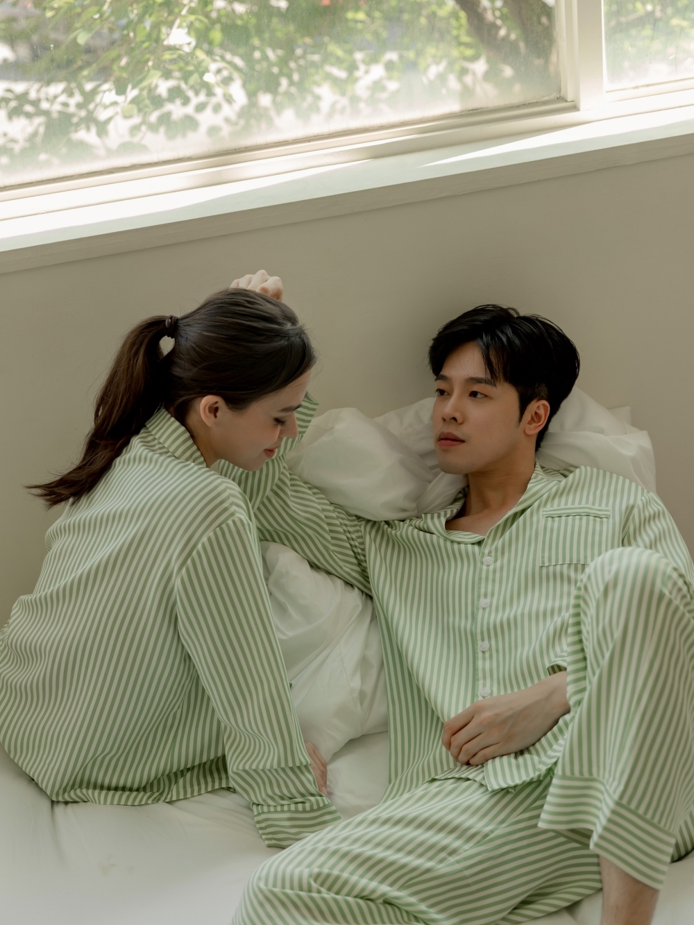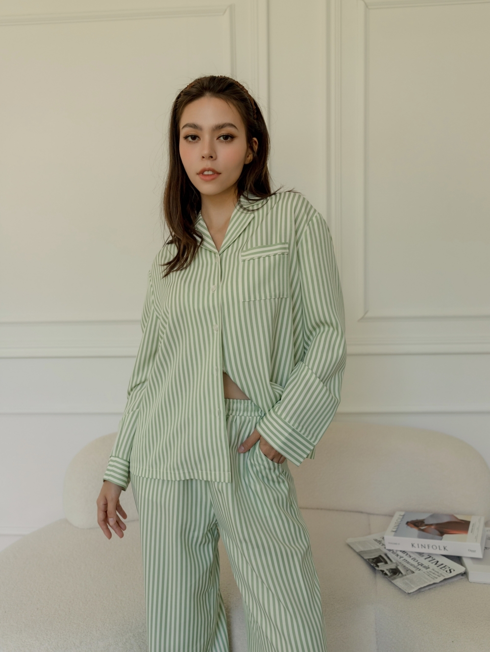 若葉綠條紋布料成分稍有不同, 75% 聚酯纖維 25% 嫘縈,體驗超柔軟舒適兼具墜性感。