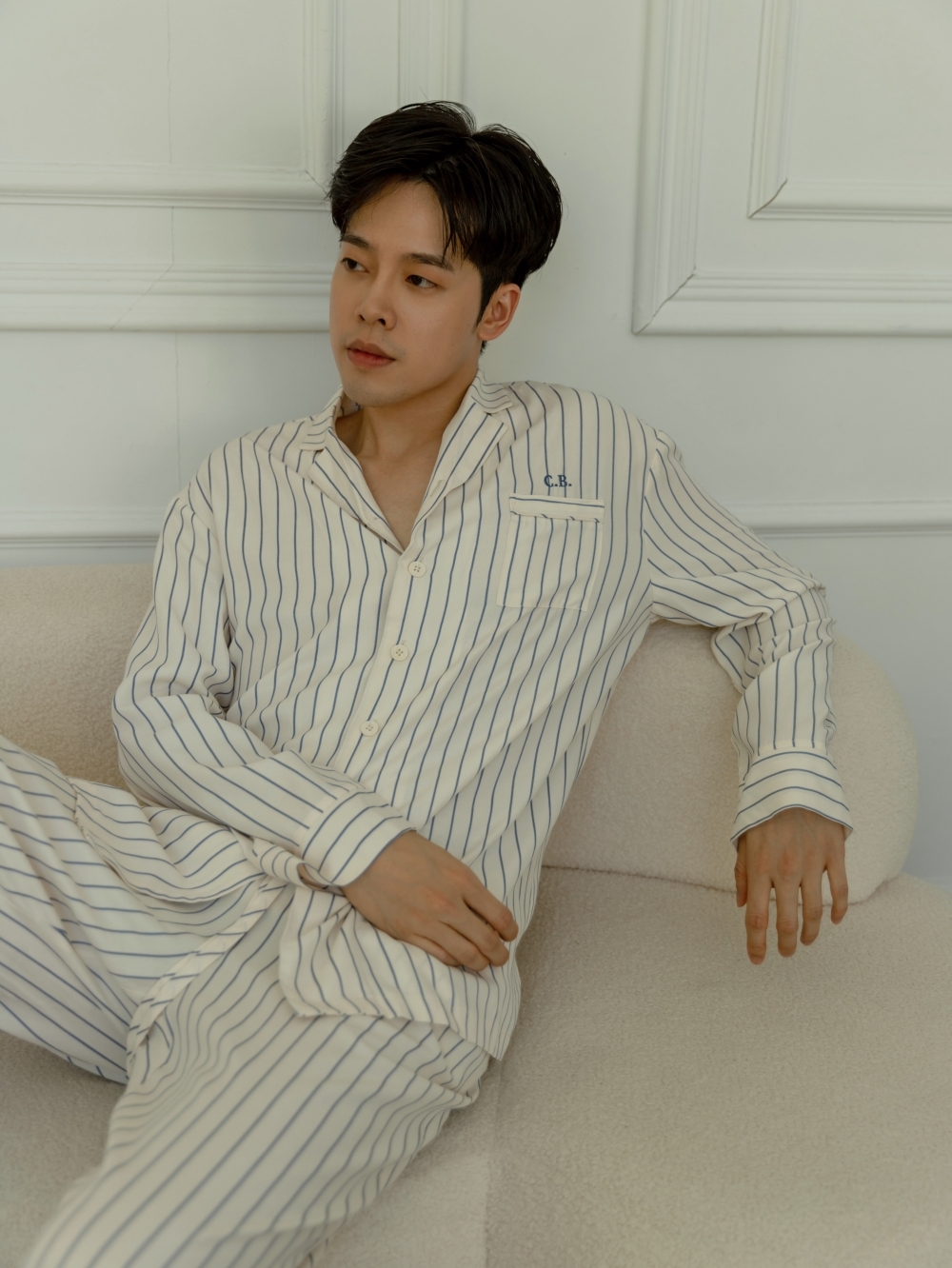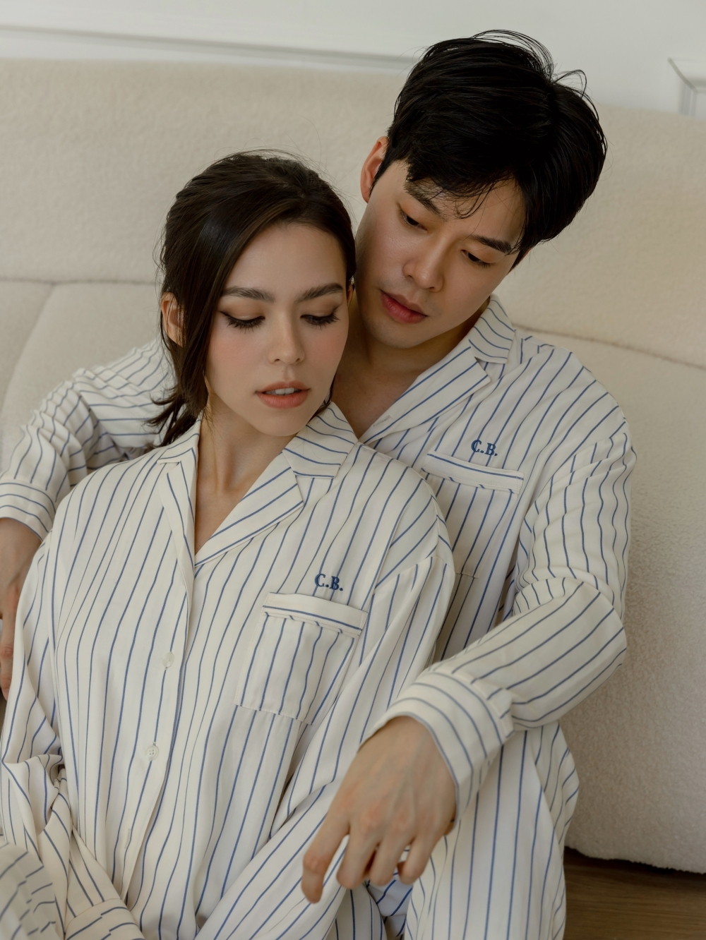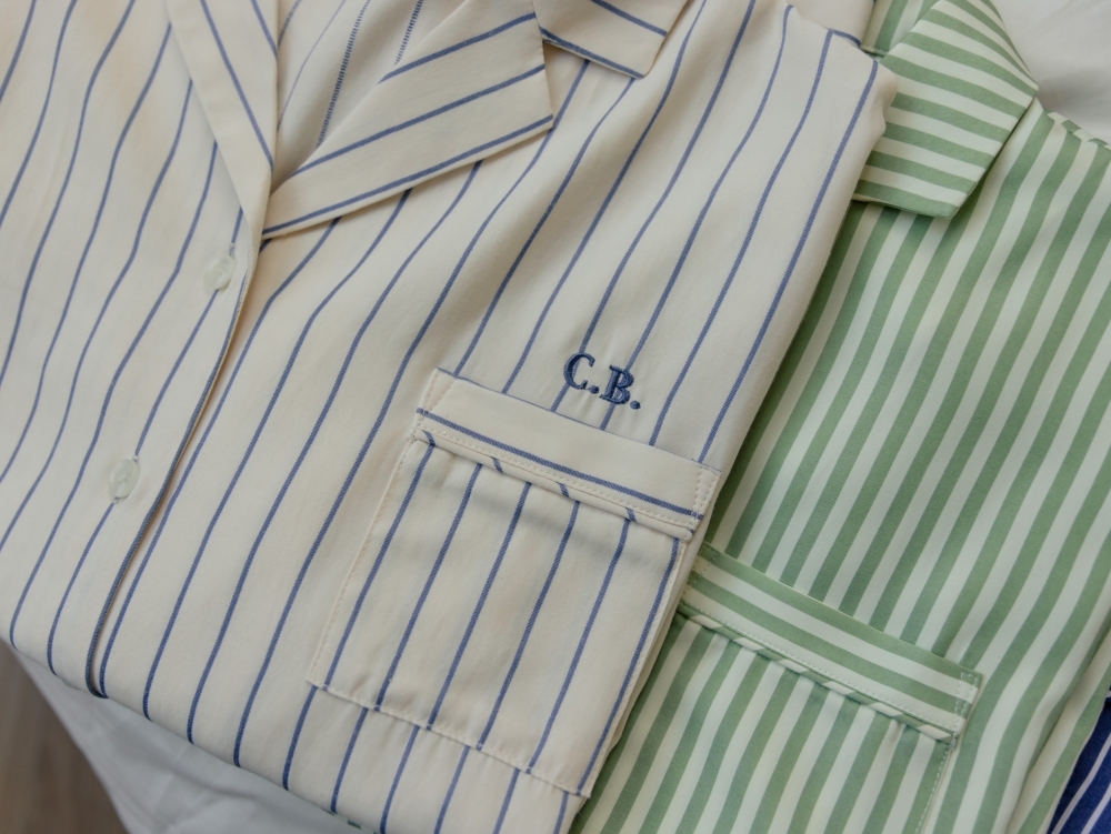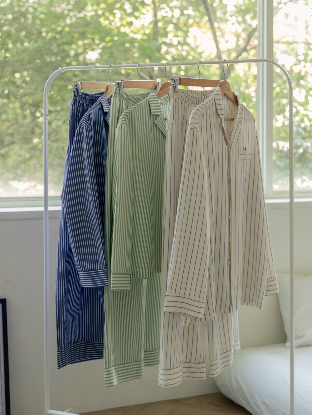 白底蔚藍條紋布料成分稍有不同, 55% 聚酯纖維 45% 嫘縈,體驗超柔軟舒適兼具墜性感。