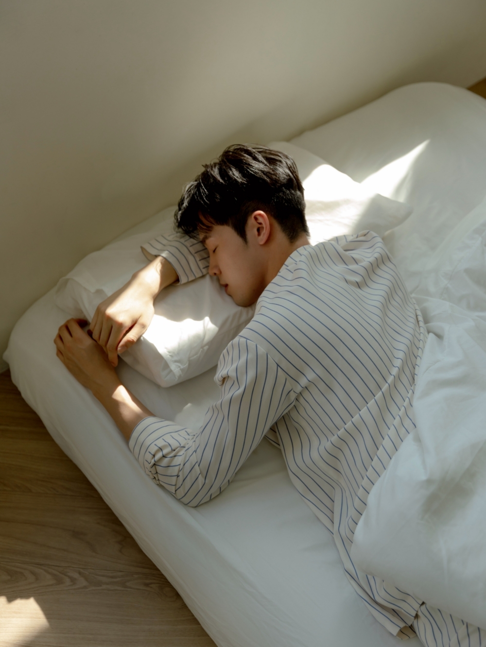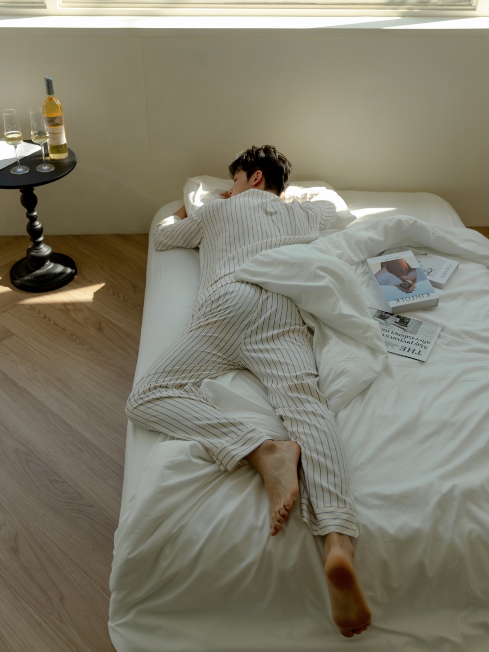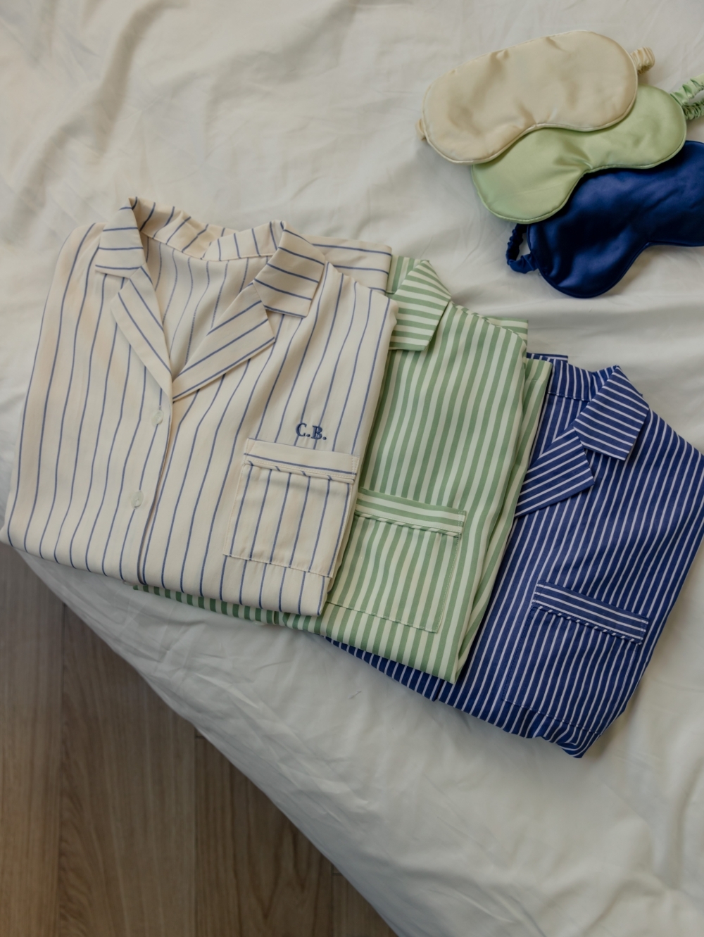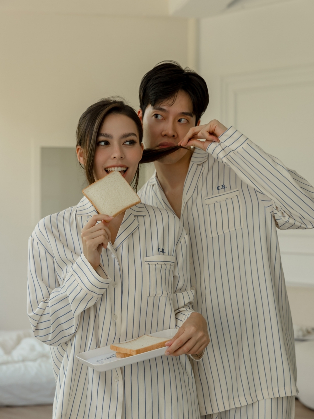 白底蔚藍條紋布料成分稍有不同, 55% 聚酯纖維 45% 嫘縈,體驗超柔軟舒適兼具墜性感。