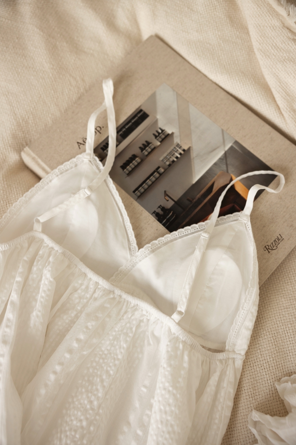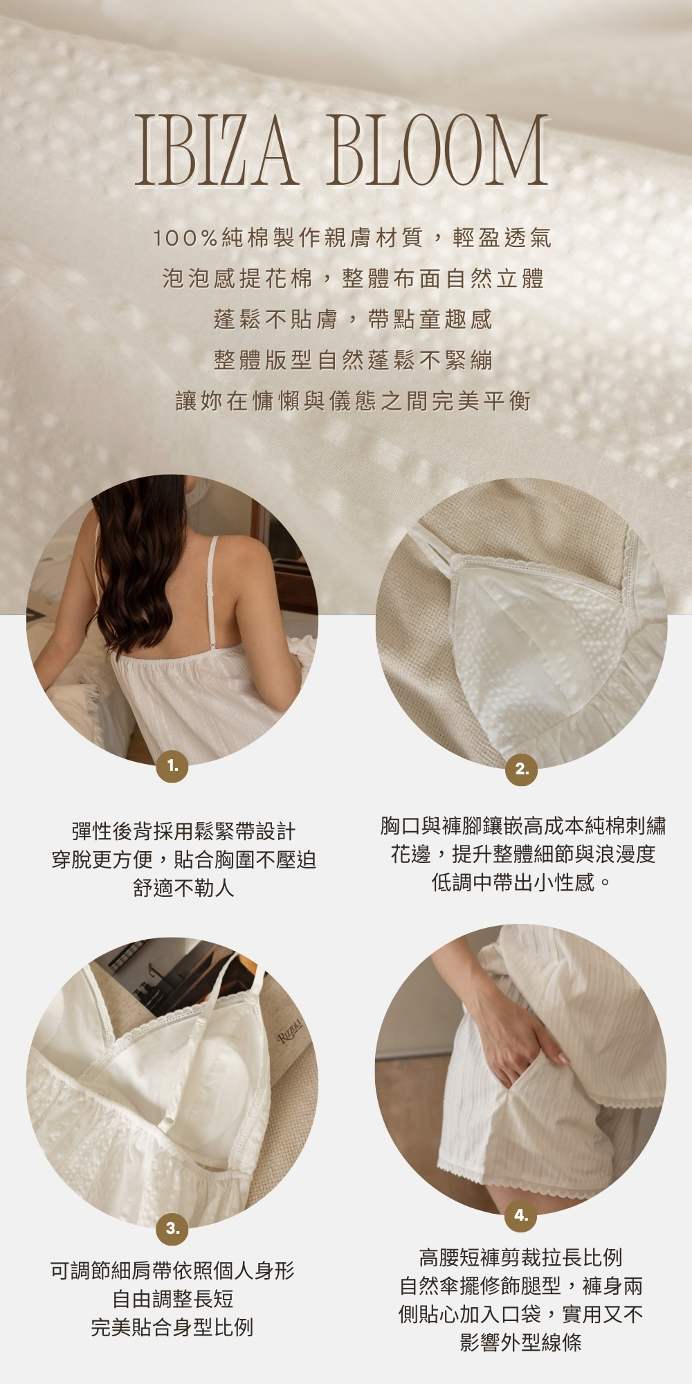 - 刺繡花邊細節:胸口與褲腳鑲嵌高成本純棉刺繡花邊,提升整體細節與浪漫度,低調中帶出小性感。